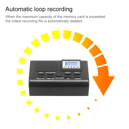 In the event that the SD card’s capacity is nearing its limit, the recorder intelligently saves new recordings while ensuring that the last 50 minutes of recording are preserved.